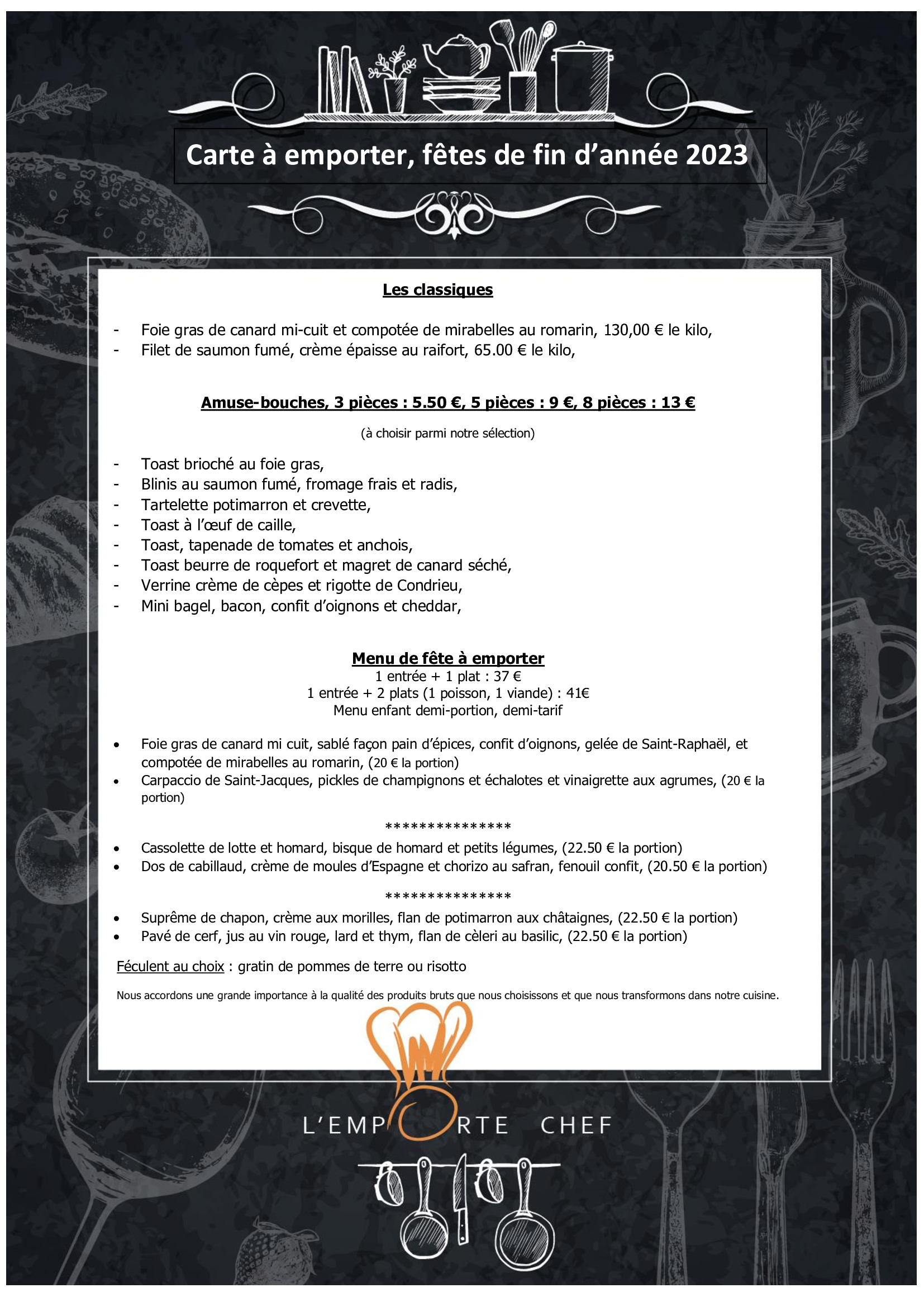 une garantie de cuisine élaborée sur place avec des produits bruts de qualité par une équipe de professionnels de la restauration. Les plats proposés doivent être diversifiés : au moins 4 plats en entrée, 4 plats principaux et 4 desserts. En outre, en matières de suggestions ponctuelles, au moins, soit une entrée, soit 1 plat principal, soit 1 dessert devront être renouvelés quotidiennement.